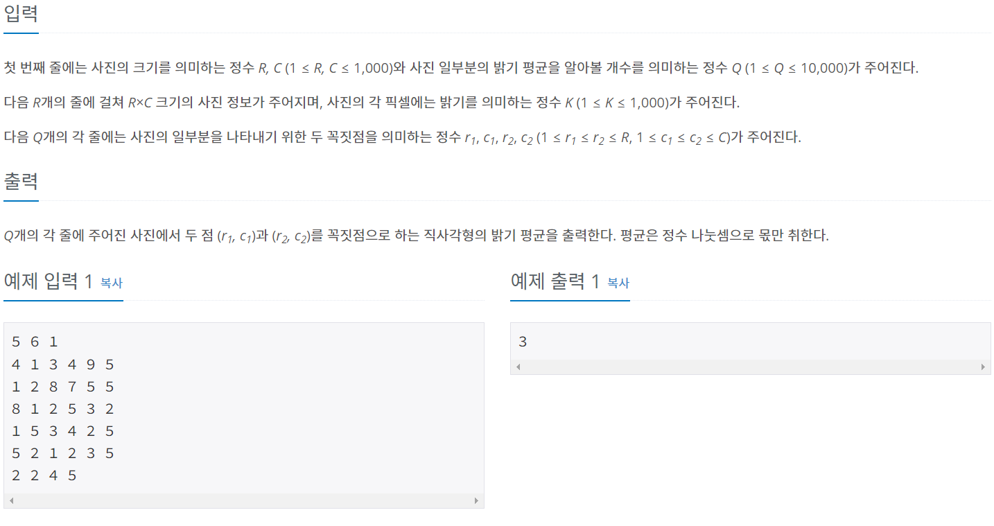 - 입력: 첫 번째 줄에는 사진의 크기를 의미하는 정수 R, C(1 ≤ R, C ≤ 1,000)와 사진 일부분의 밝기 평균을 알아볼 개수를 의미하는 정수 Q(1 ≤ Q ≤ 10,000)가 주어진다.