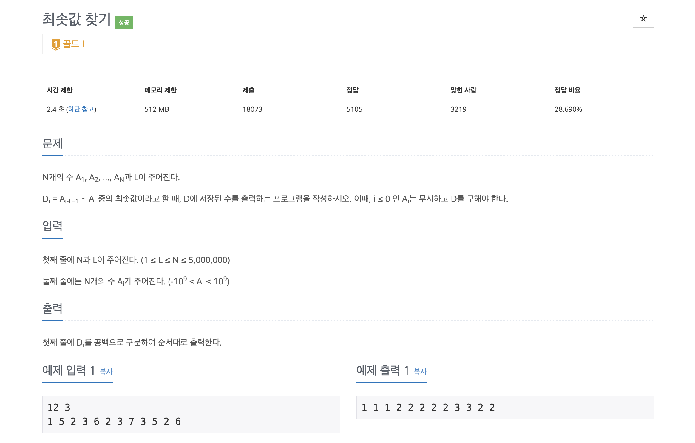 해당 문제는 일정한 구간에 대한 최소값을 구하는 문제이다.