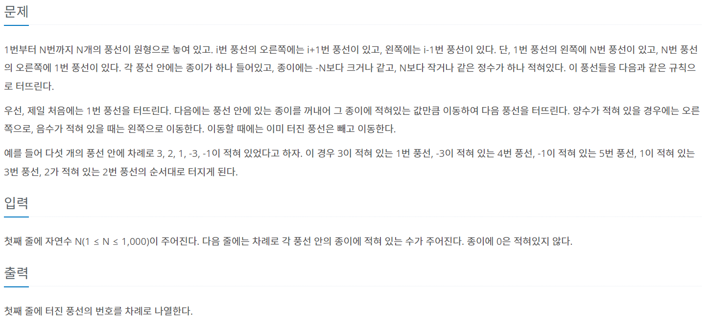 1번부터 N번까지 N개의 풍선이 원형으로 놓여 있고. i번 풍선의 오른쪽에는 i+1번 풍선이 있고, 왼쪽에는 i-1번 풍선이 있다. 단, 1번 풍선의 왼쪽에 N번 풍선이 있고, N번 풍선의 오른쪽에 1번 풍선