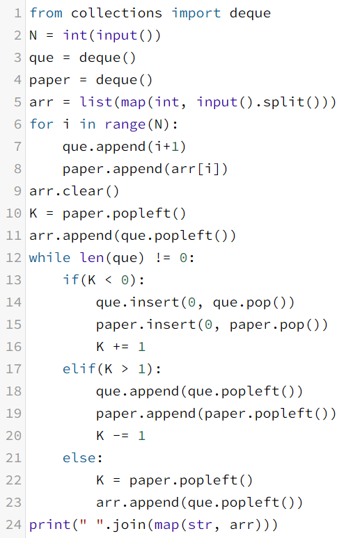 그런 다음 que가 빌때까지 while문을 돌게 되는데 K가 양수면 앞으로 이동해야하므로 앞쪽을 pop해서 뒤로 넣어주고 K에서 1을 빼주게 된다. K가 음수면 반대로 이동해야하므로 뒷쪽을 pop해서 맨앞에 넣어주었다.