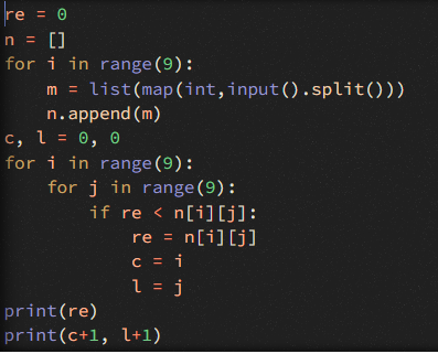 첫째 줄에 최댓값을 출력하고, 둘째 줄에 최댓값이 위치한 행 번호와 열 번호를 빈칸을 사이에 두고 차례로 출력한다. 최댓값이 두 개 이상인 경우 그 중 한 곳의 위치를 출력한다.