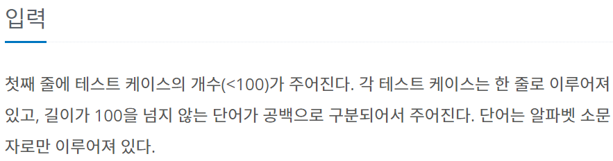 첫째 줄에 테스트 케이스의 개수(<100)가 주어진다. 각 테스트 케이스는 한 줄로 이루어져 있고, 길이가 100을 넘지 않는 단어가 공백으로 구분되어서 주어진다. 단어는 알파벳 소문자로만 이루어