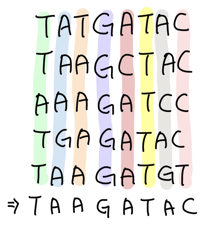 입력받은 DNA들과의 Hamming Distance 합이 최소가 되기 위해서는 각 열 별로 빈도가 가장 높은 문자를 찾으면 그 DNA는 최소의 Hamming distance를 가질 수 있습니다.