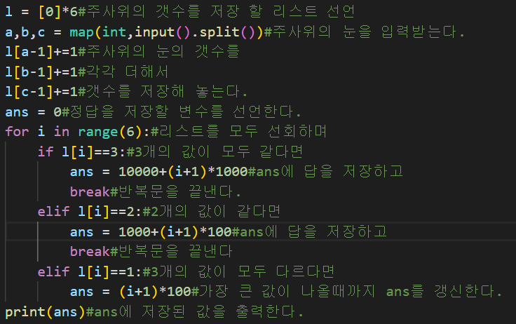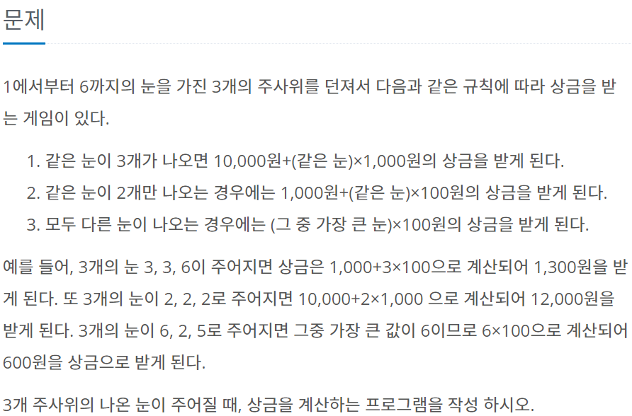 1에서부터 6까지의 눈을 가진 3개의 주사위를 던져서 다음과 같은 규칙에 따라 상금을 받는 게임이 있다. 같은 눈이 3개가 나오면 10,000원+(같은 눈)×1,000원의 상금을 받게 된다. 같은 눈이 2개