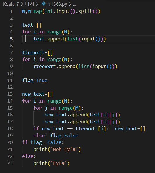 if문을 사용하여 늘린 문자와 입력받은 문자가 같지 않을 경우 flag를 걸어서 확인한다.