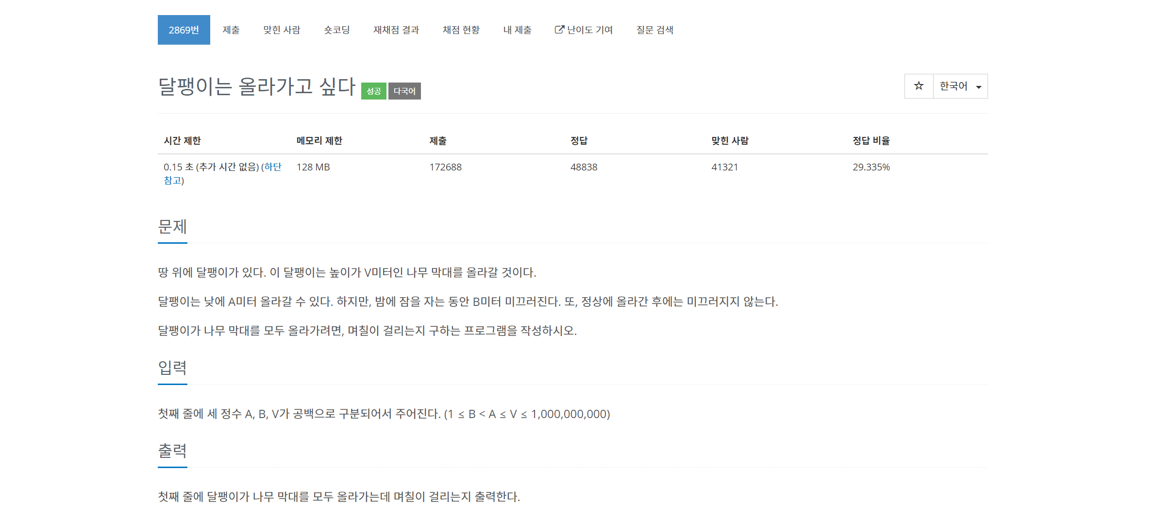 목표량(v)에서 낮에 올라가는 만큼(a) 뺀 값을 goal, a - b는 하루 이동 속도(speed)로 설정하고 돌려보았다. 처음 시도했던 반복문을 이용한 알고리즘은 제한시간을 초과하기 쉬운 로직이므로 제어문을 이용해서 비교연산 정도만 넣어서 구현하고자 했다.