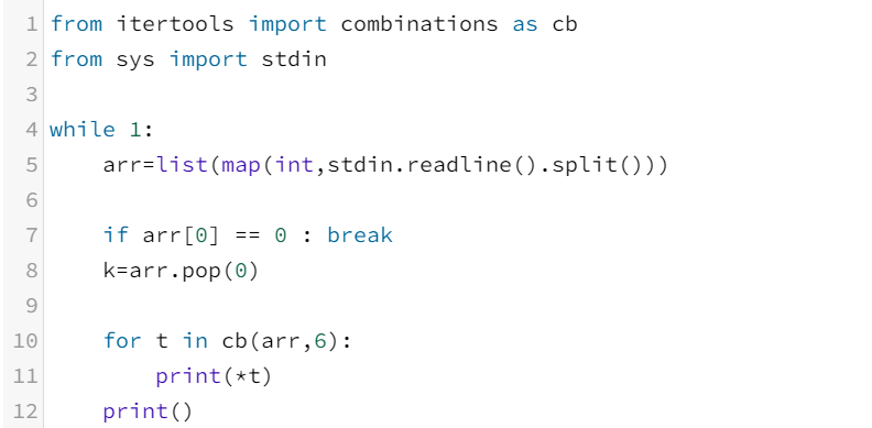입력은 여러 개의 테스트 케이스로 이루어져 있다. 각 테스트 케이스는 한 줄로 이루어져 있다. 첫 번째 수는 k (6 < k < 13)이고, 다음 k개 수는 집합 S에 포함되는 수이다. S의 원소는 오름차순으로