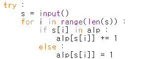 try를 이용하여 사용자로부터 문자열을 입력받고, 입력받은 문자열의 알파벳 딕셔너리를 만든다. 딕셔너리 키는 알파벳, 벨류는 등장 횟수로 한다.