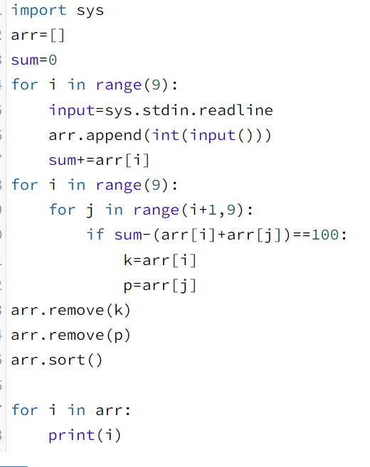 일단 9명의 키를 리스트에 저장후 sum값에 리스트에 들어있는 모든 수를 더한다. 그리고 1번째요소 부터 9번째까지 2번째요소부터 9번째까지 .. 이렇게 해 보면 2개를 뺐을때 정확히 100이 되게 하는 2개의 숫자를 고를 수있다. 그리고 이 둘을 리스트에서 제거하고 정렬한 다음 하나씩 출력하면 된다.