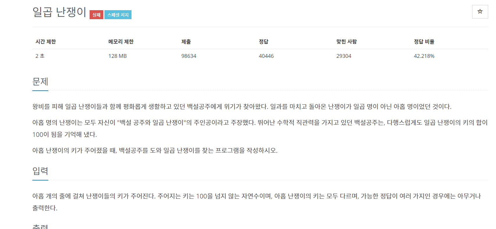 일단 9명의 키를 입력한다.(풀이 방법이 2가지 있지만 조합을 사용하는 방법이 아닌 방법으로 풀어보면)