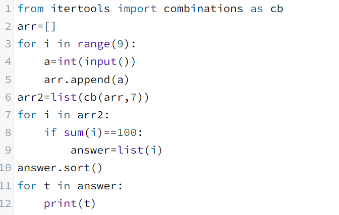 그리고 조합을 이용하는 방식으로 풀어보면 9개중 7개를 뽑는 조합에서 그합이 100이 되는 조합을 고르면 된다. 그리고 그걸 list로 만들고 정렬하고 출력하면 된다