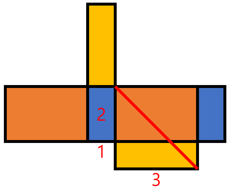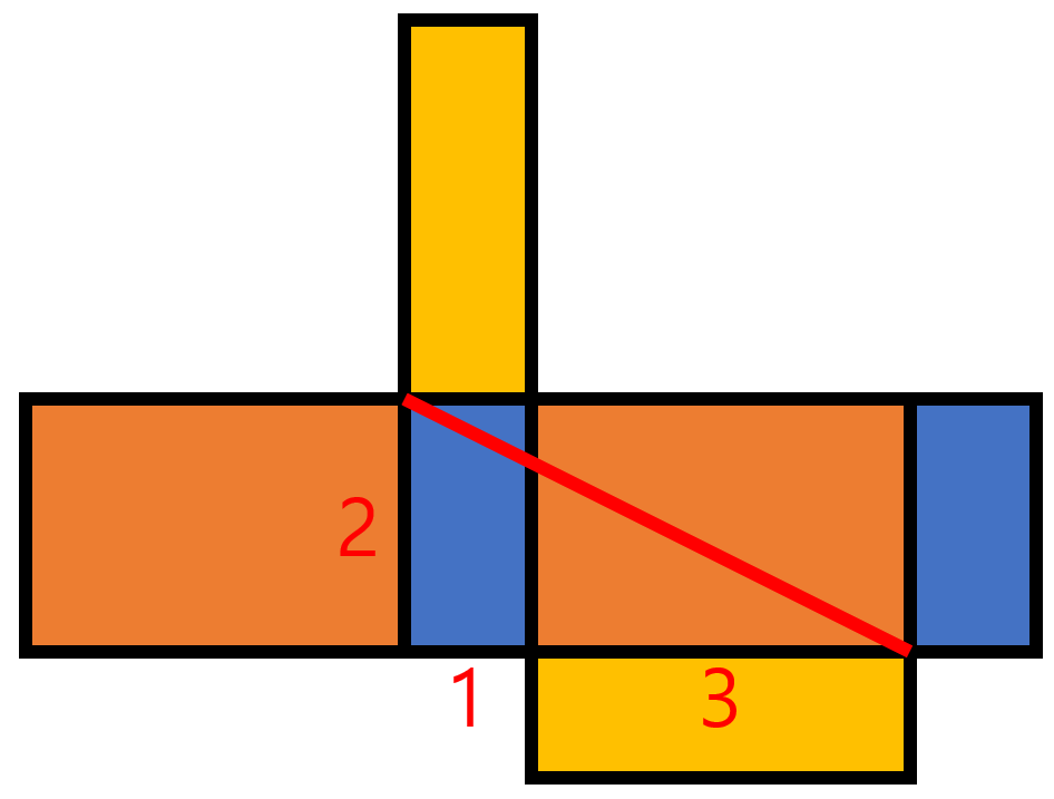 그러면 문제를 제대로 이해하였으니 한 꼭짓점에서 다른 꼭짓점까지 이동하는 직선 최단 경로를 구해봅시다. 예제 입력의 가로 1, 세로 2, 높이 3의 직육면체의 전개도를 그려보면