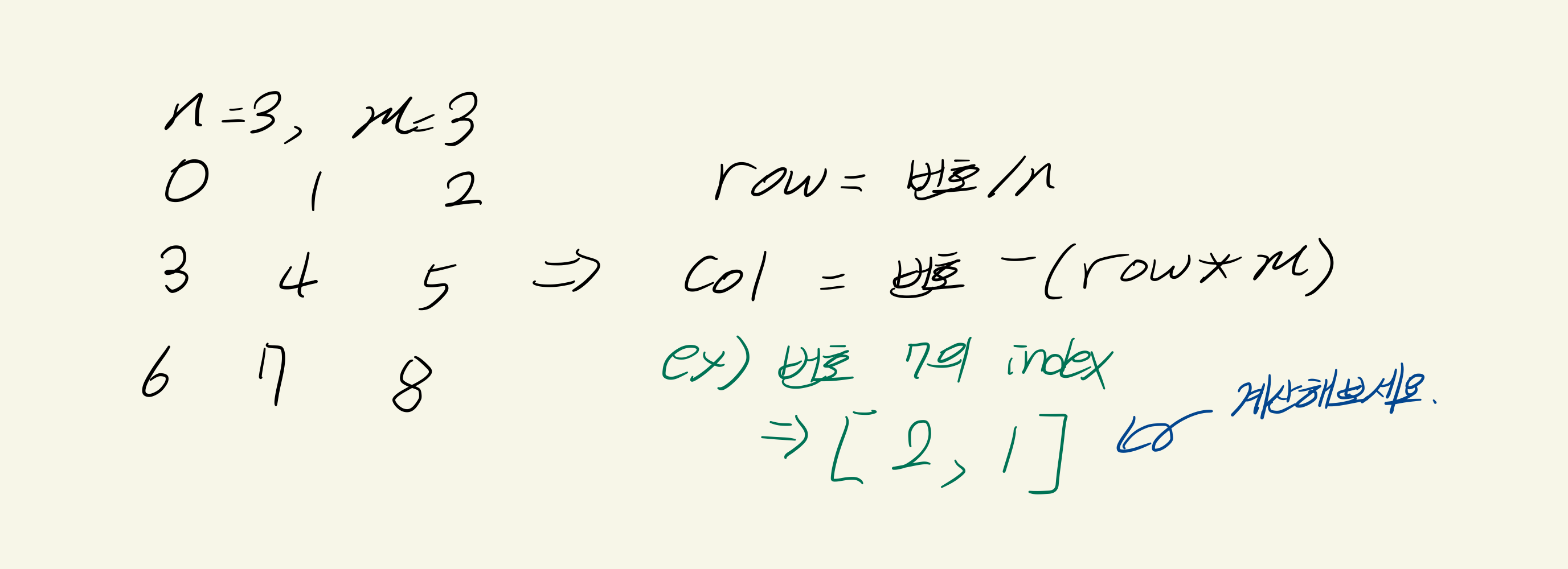 우리는 각 자리의 숫자를 원본 2차원 배열의 row, col과 연결시켜야합니다. 즉, 위 그림에서 '5'번 자리는 원본 배열의 [1, 3]위치여야 한다는 것이죠. 아 이거 뭔가 수업시간에서 배웠던 것 같은데.... 까먹어서 다음과 같은 식을 머리 깨져가면서 찾았습니다.