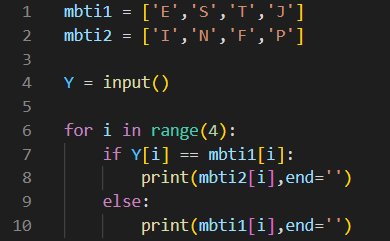 입력 받은 연길이의 MBTI와 mbti1 리스트의 동일한 인덱스가 가르키고 있는 문자를 비교한다. 이때, 연길이의 MBTI에 있는 문자가 mbti1 리스트에 존재한다면 mbti2 리스트의 동일한 인덱스가 가르키는 문자를 출력한다. end를 이용해 문자간의 간격 없이 출력한다.