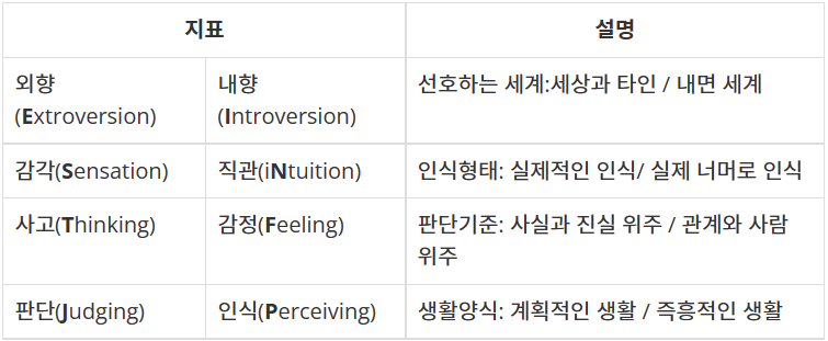 MBTI는 다음과 같은 네 가지 척도로 성격을 표시한다. 각각의 척도는 두 가지 극이 되는 성격으로 이루어져 있다.