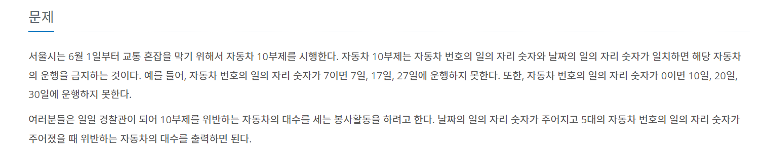 주어진 날짜와 자동차의 일의 자리 숫자를 보고 10부제를 위반하는 차량의 대수를 출력한다.
