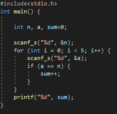 날짜를 변수 n으로 선언한 후 scanf를 통해 값을 입력받음. 변수 a의 값을 입력받고 입력값과 n을 비교하여 둘의 값이 같다면 변수 sum의 값을 1씩 더해주는 코드를 다섯 번 반복되는 for문 속에 넣음. 그 후 sum값을 출력함.