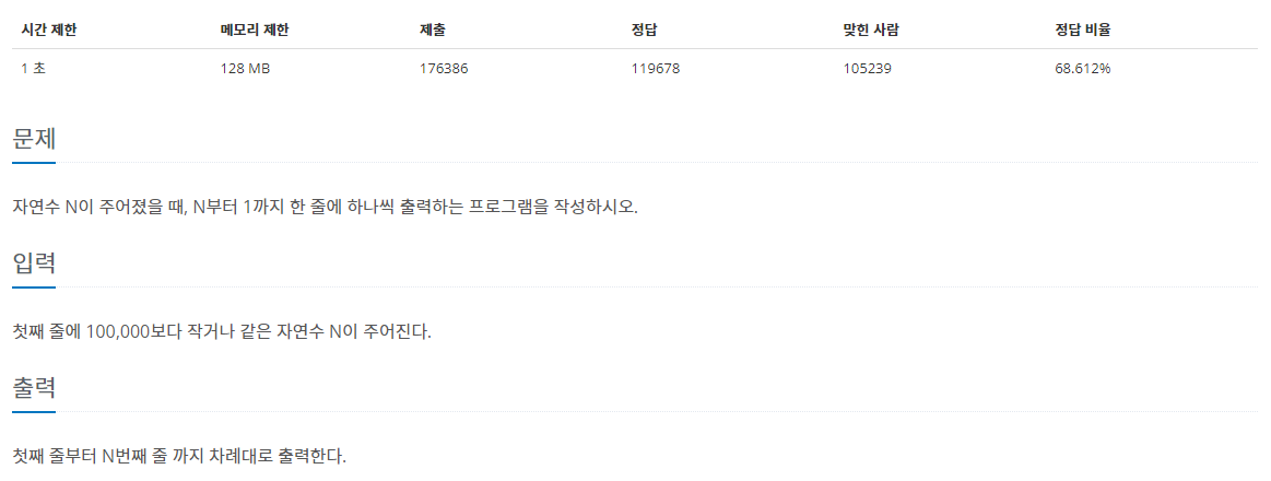 자연수 N이 주어졌을 때, N부터 1까지 한 줄에 하나씩 출력하는 프로그램을 작성하시오.