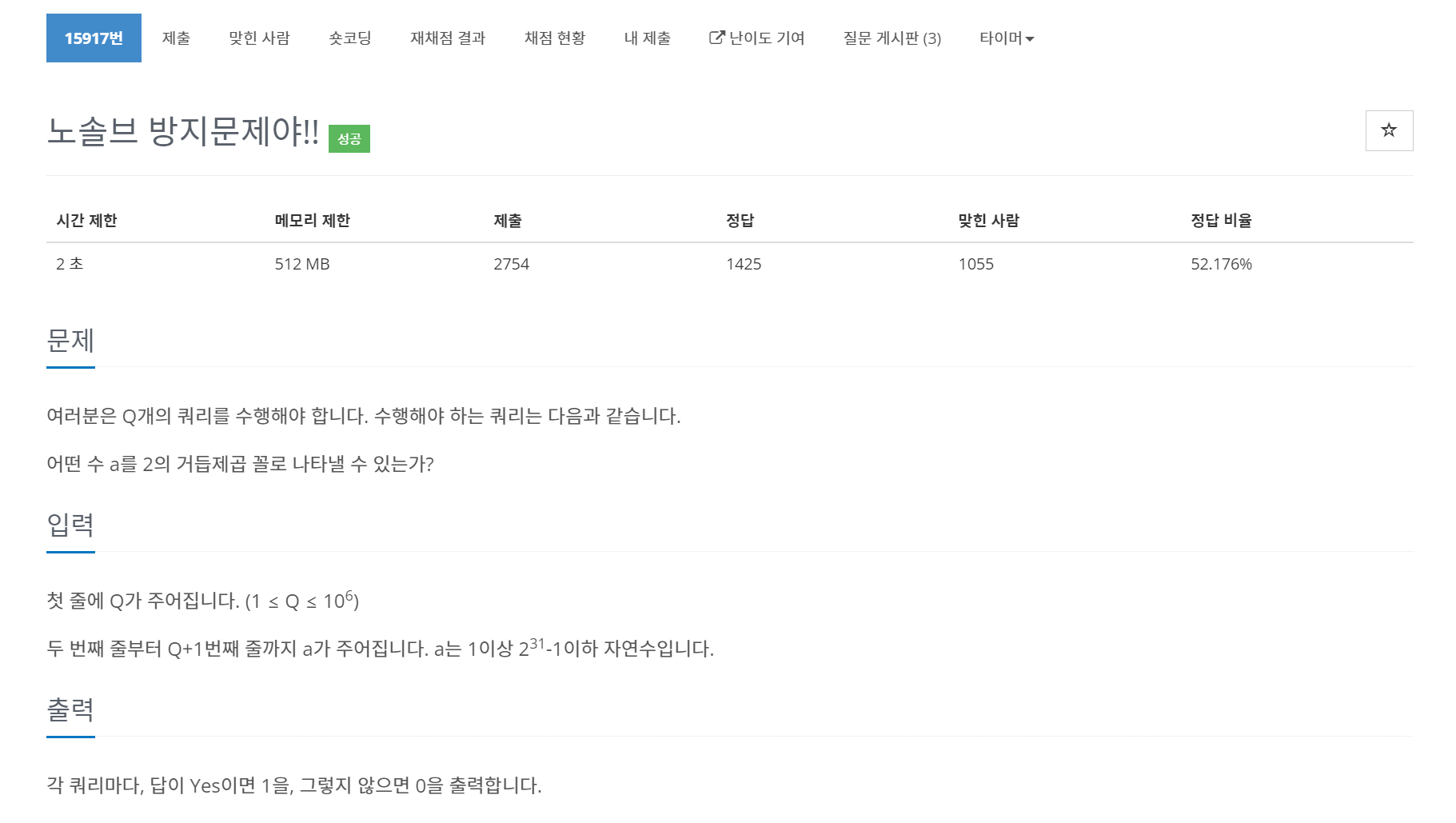 주어진 숫자를 2^n으로 딱 떨어지게 표현할 수 있으면 1, 아니면 0을 출력해야 하는 문제이다.