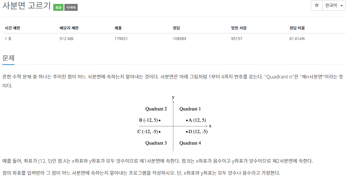 x, y값의 부호에 따라 몇 사분면에 해당하는지 구하는 문제이다.