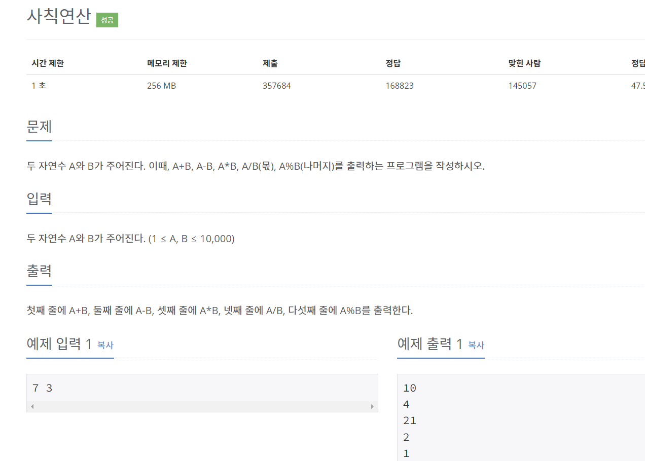 두 자연수 A와 B가 주어진다. 이때, A+B, A-B, A*B, A/B(몫), A%B(나머지)를 출력하는 프로그램을 작성하시오.