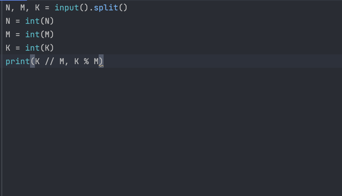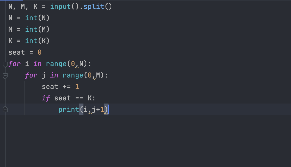 첫째 줄에 관중석의 크기를 나타내는 N, M과 잃어버린 관중석 번호를 나타내는 K가 주어진다. (1 ≤ N, M ≤ 30,000, 0 ≤ K ≤ N×M-1)