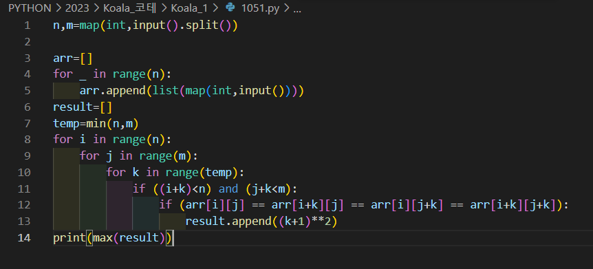 nxm 크기의 직사각형에서 각 꼭짓점이 같은 숫자인 정사각형의 최대 크기를 찾는 문제이다.