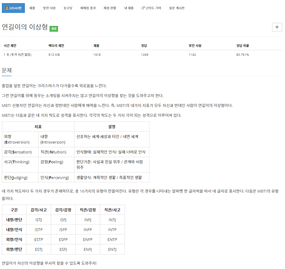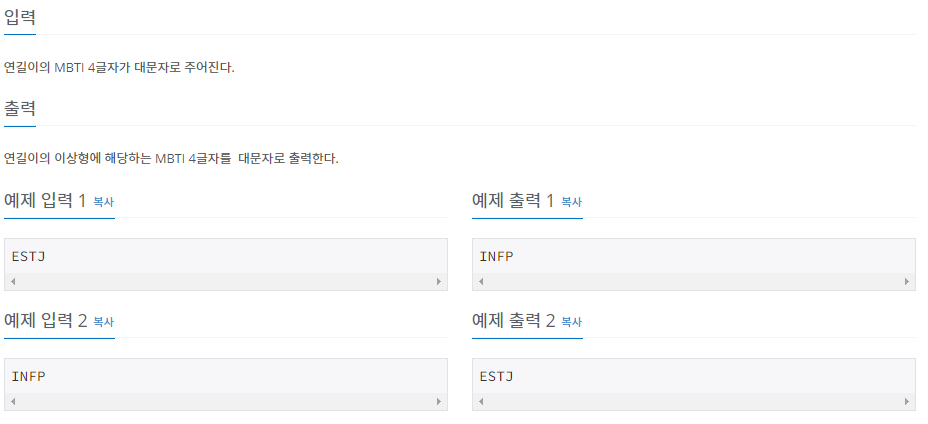배열에 모든 MBTI 알파벳을 저장해두고 입력받은 MBTI알파벳을 지운 뒤 문자열로 합치면 된다.