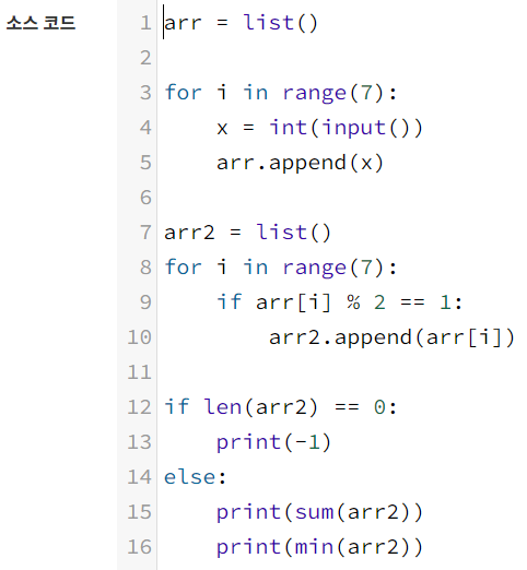그리고 arr 리스트에 홀수가 없어서 arr2 리스트가 아무것도 없을 때를 위해 len(arr2) == 0일 때 -1일을 출력하도록 설정했다. 그 외의 경우에는 sum함수와 min함수를 이용하여 값을 출력하도록 했다.