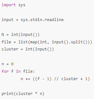 클러스터의 용량 $c\in\Bbb Z,\ c\geq0$과 파일의 용량 $f\in\Bbb Z,\ f\geq 0$에 대해 각 파일이 팔요로 하는 클러스터의 개수는 $(f-1)$을 $c$로 나눈 몫에 1을 더한 값이 된다. 이는 $f=0$일 때도 성립한다. 각 파일에 필요한 클러스터의 수의 총합에 클러스터의 크기를 곱하면 구하는 값이 된다.