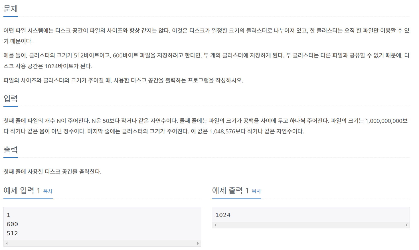 첫째 줄에 파일의 개수 N이 주어진다. N은 50보다 작거나 같은 자연수이다. 둘째 줄에는 파일의 크기가 공백을 사이에 두고 하나씩 주어진다. 파일의 크기는 1,000,000,000보다 작거나 같은 음이 아닌