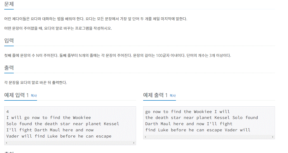 문장 맽 앞에 있는 두 단어를 맨 뒤로 보낸 다음 다시 출력하면 된다.