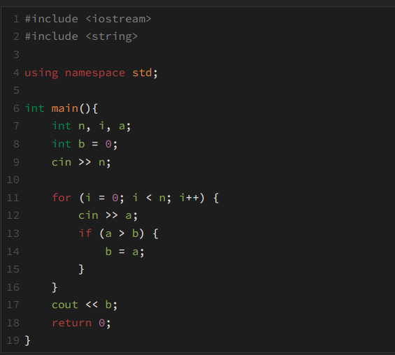 배열 속 원소의 개수인 n을 입력받고, n번 반복되는 반복문을 사용해서 원소들을 입력받아서 가장 큰 수를 변수에 저장한 뒤에 출력하면 되는 것이다.