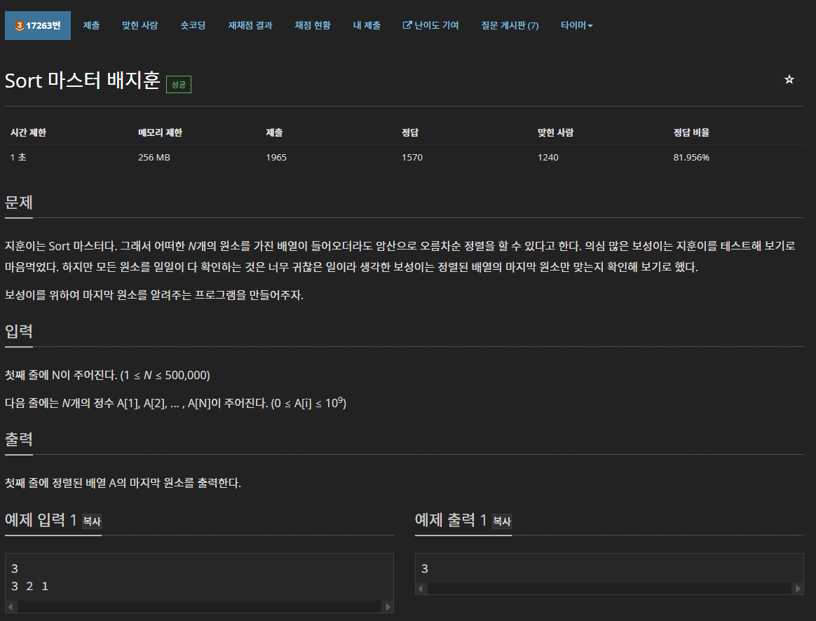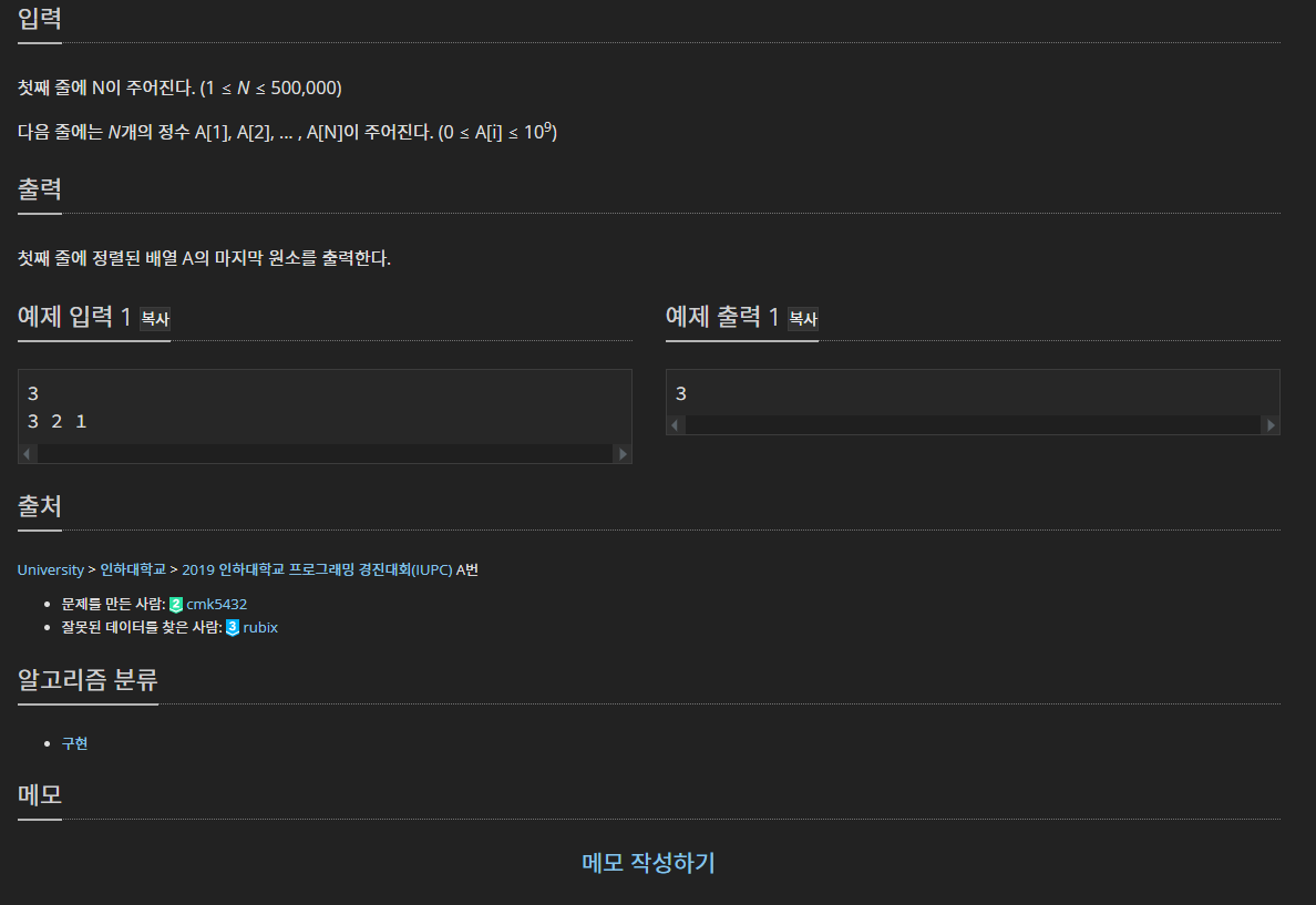 n개의 원소가 있는 배열을 오름차로 정렬했을 때 가장 오른쪽에 오는 수를 출력하는 문제이다.