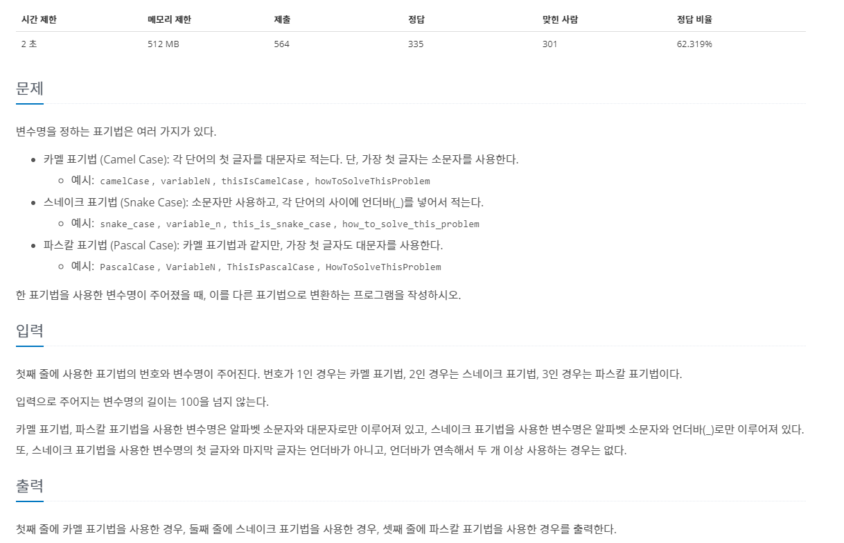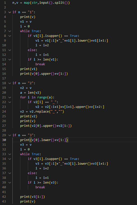 첫째 줄에 사용한 표기법의 번호와 변수명이 주어진다. 번호가 1인 경우는 카멜 표기법, 2인 경우는 스네이크 표기법, 3인 경우는 파스칼 표기법이다. 입력으로 주어지는 변수명의 길이는 100을