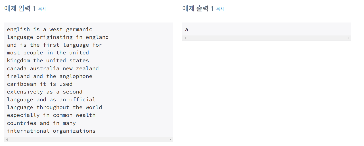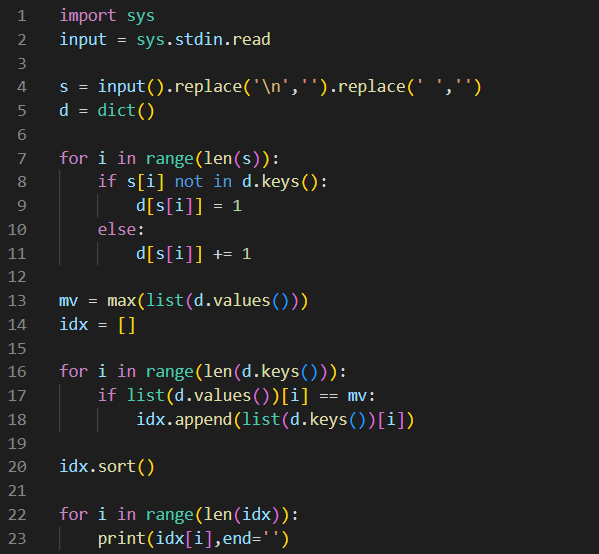 첫째 줄에 가장 많이 나온 문자를 출력한다. 여러 개일 경우에는 알파벳 순으로 앞서는 것부터 모두 공백없이 출력한다.