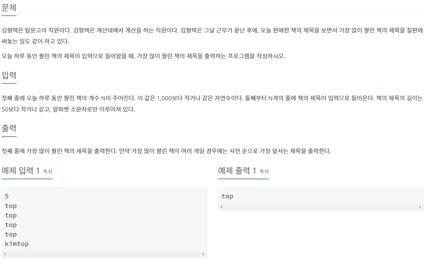 우선 책을 입력받고 boo라는 딕셔너리 안에 책이 없다면 key값을 만들어주고 value 값으로 1을 준다. 그런식으로 모두 받은 다음 value값중 가장 큰 값을 max함수로 찾아내고 max로 찾은 값과 매칭하여 책을 찾아낸다. 그중 사전순으로 정렬할때가장앞의 값을 출력한다.