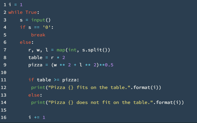 입력은 여러 개의 테스트 케이스로 이루어져 있다. 각 테스트 케이스는 숫자 세 개로 이루어져 있고, 순서대로 r, w, l이다. r은 식탁의 반지름이고, w와 l은 피자의 너비와 높이이다. (1 ≤ r ≤ 1000