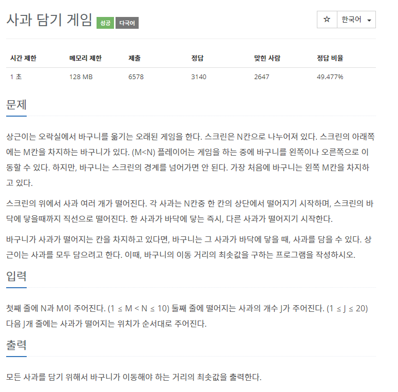 상근이는 오락실에서 바구니를 옮기는 오래된 게임을 한다. 스크린은 N칸으로 나누어져 있다. 스크린의 아래쪽에는 M칸을 차지하는 바구니가 있다. (M<N) 플레이어는 게임을 하는 중에 바구니를
