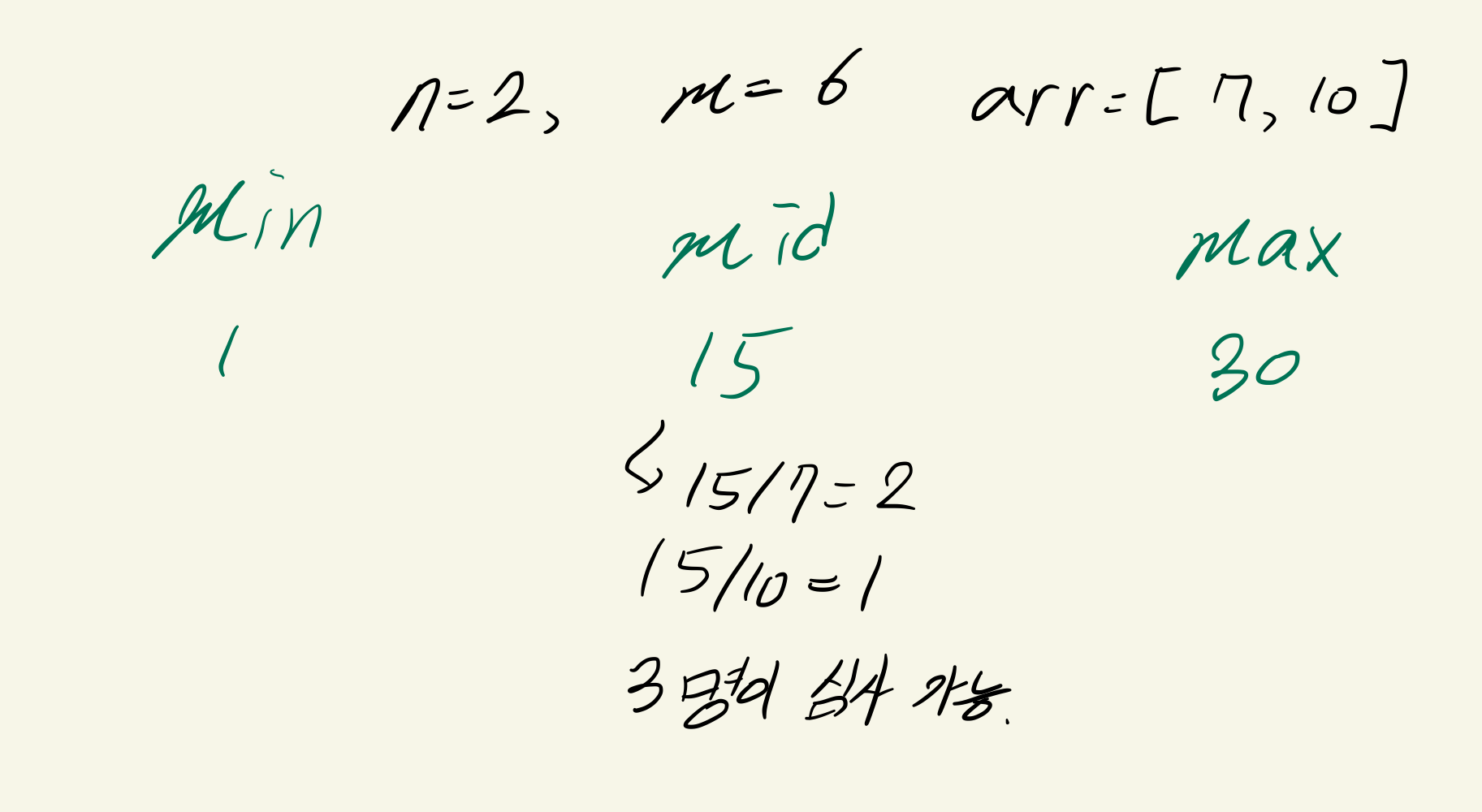 15초가 주어진 경우에는 3명만 심사가 가능합니다. 6명이 심사를 받아야 하므로 시간초를 늘리기 위해 left를 mid+1해줍니다.