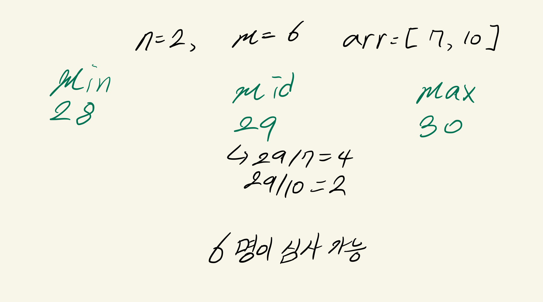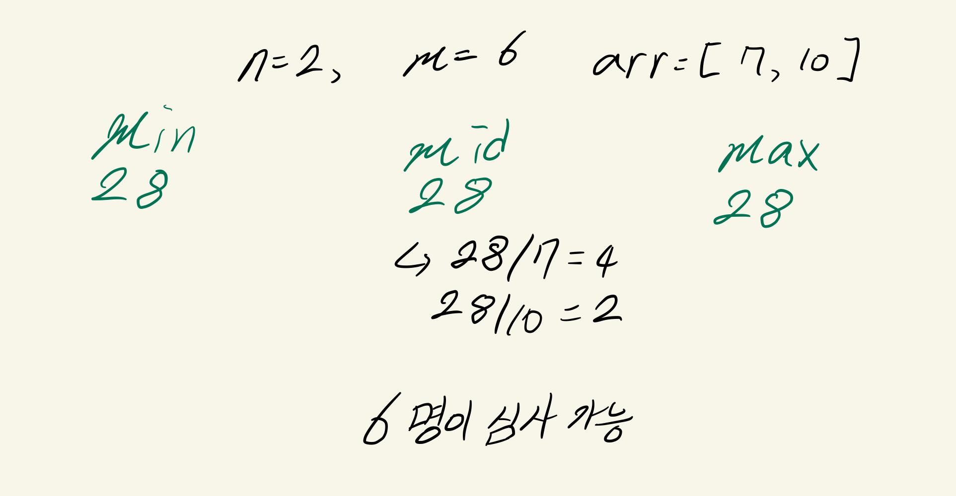또한, 28초에도 28 / 7 = 4, 28 / 10 = 2 --> 6명이 입국 심사를 받을 수 있어 답이 될 수 있습니다.