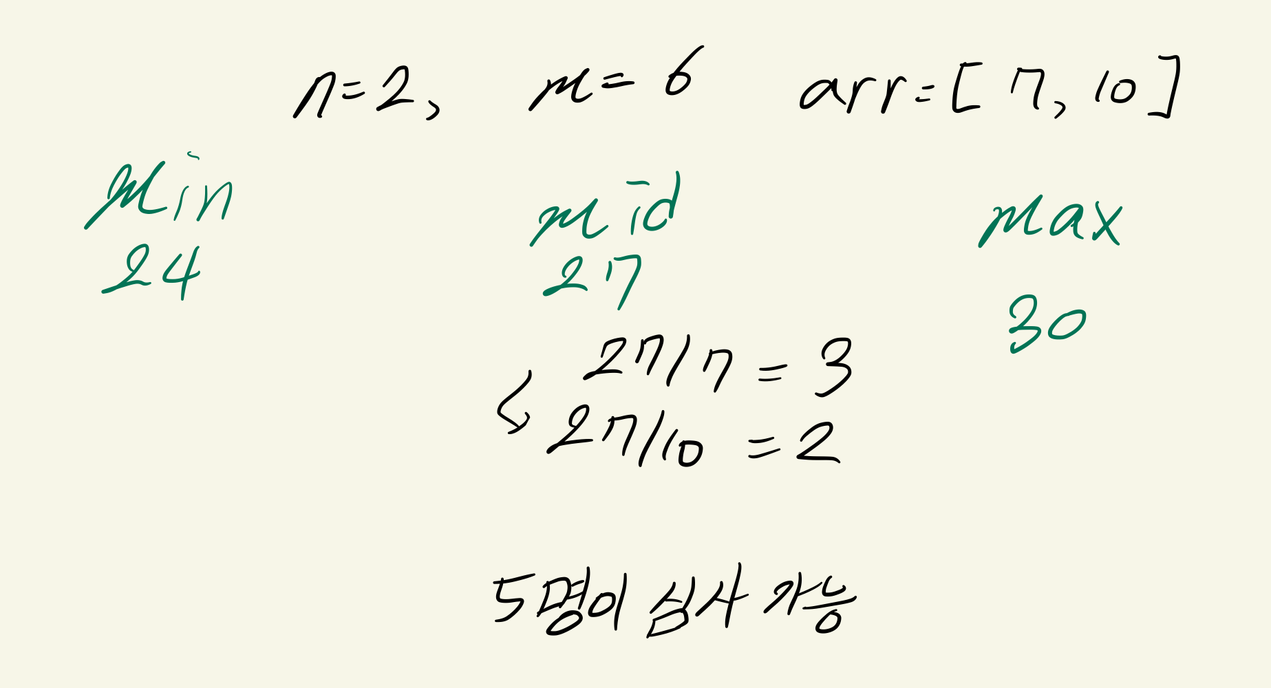 27초가 주어진 경우에도 5명만 심사가 가능합니다. left = mid+1을 해줍니다.
