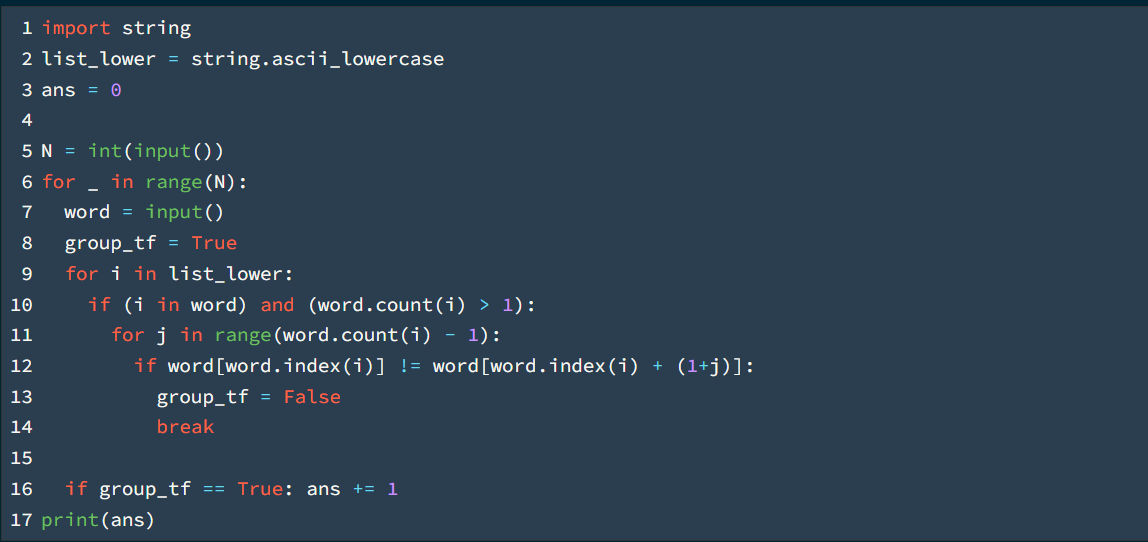 line 11 - 14: 그룹 단어가 될려면 1개 이상인 알파벳이 반드시 붙어있어야 하기 때문에 하나라도 붙어있지 않으면 group_tf = False로 바꾸어 반복문을 탈출한다.