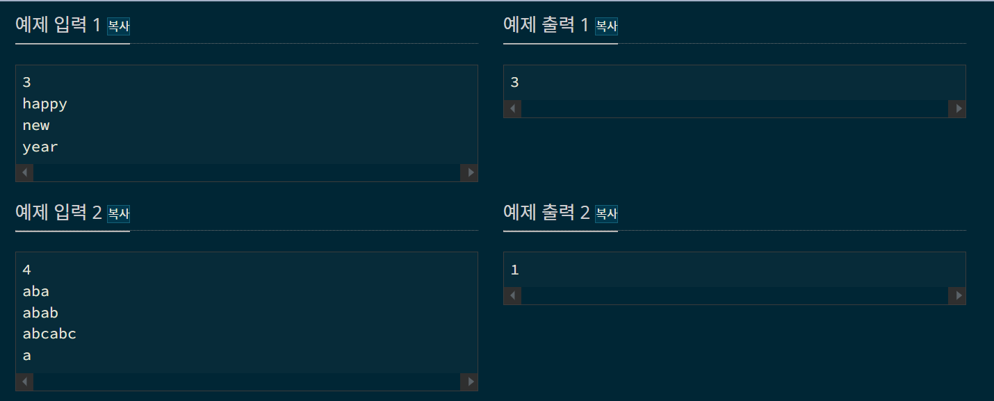첫째 줄에 단어의 개수 N이 들어온다. N은 100보다 작거나 같은 자연수이다. 둘째 줄부터 N개의 줄에 단어가 들어온다. 단어는 알파벳 소문자로만 되어있고 중복되지 않으며, 길이는 최대 100이다.