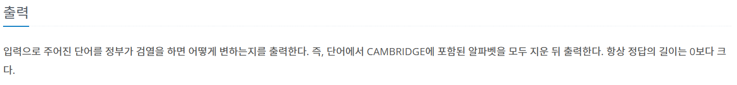 - 삭제해야 되는 알파벳들을 포함한 문자열인 'CAMBRIDGE'를 delw에 저장