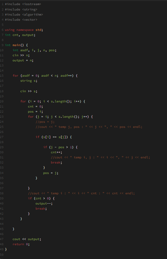 반복문을 나오며, 결과값을 저장하기 위해서 선언한 변수 output에 그룹 단어가 아니라면 1을 빼게 만들어서 계산을 끝낸 뒤, 그룹단어의 개수를 출력할 수 있게 합니다.