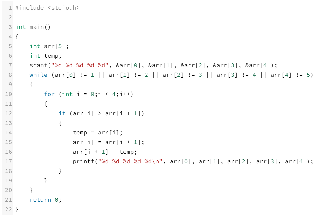 첫째 줄에 조각에 쓰여 있는 수가 순서대로 주어진다. 숫자는 1보다 크거나 같고, 5보다 작거나 같으며, 중복되지 않는다. 처음 순서는 1, 2, 3, 4, 5가 아니다.