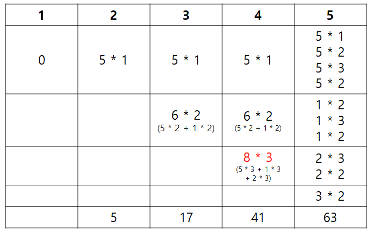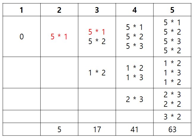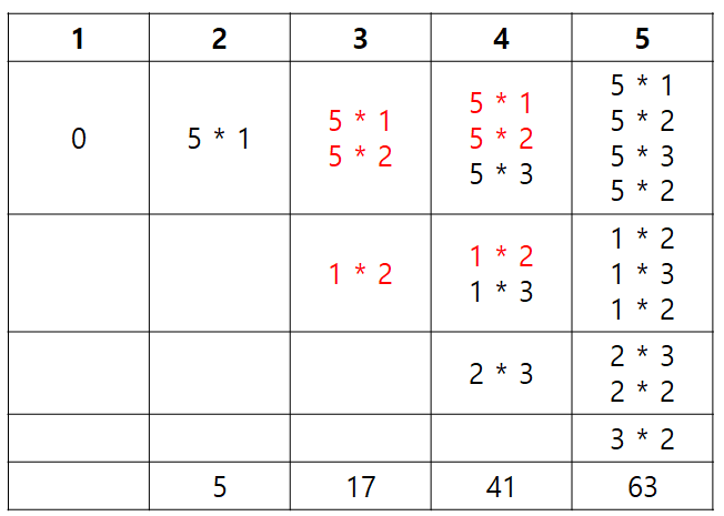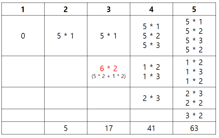 (1 ~ 5 팀의 리그전 누적 합) - (1 ~ 3 팀의 리그전 누적 합) - (1, 2, 3 팀이 4팀과 경기한 재미 총합)