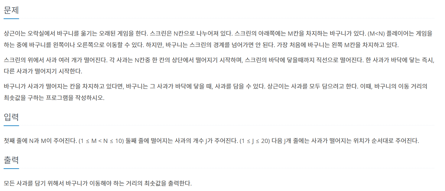 상근이는 오락실에서 바구니를 옮기는 오래된 게임을 한다. 스크린은 N칸으로 나누어져 있다. 스크린의 아래쪽에는 M칸을 차지하는 바구니가 있다. (M<N) 플레이어는 게임을 하는 중에 바구니를
