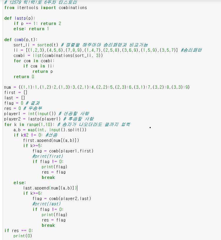 player가 체크할 때마다 리스트에 추가해주어 리스트를 완성시키고, 매겨변수로 player와 리스트를 받아 승리패턴이 나오면 player 번호를 리턴, 승리패턴이 나오진 않으면 0 리턴을 하는 함수를 만들어주었다.